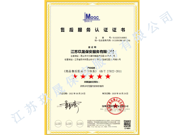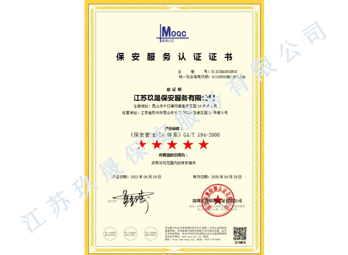 江蘇玖晟保安服務有限公司成立于江蘇省昆山市千燈鎮。注冊資金:2000萬,是擁有省公安廳頒發的保安服務許可證的企業【蘇公保服20170046】,也是昆山市保安協會常務理事單位。